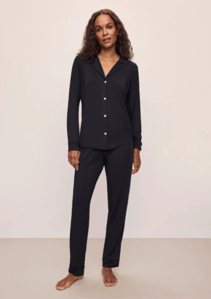 The PJ that started it all. Made from TENCEL™ Modal fibers and a touch of elastane, this buttery soft fabric is verified by OEKO-TEX® Standard 100, meaning it’s dyed with safe and non-toxic dyes. This relaxed long sleeve set features contrast piping, a button-front top with a notch collar and functional pocket, and a low-rise straight leg pant with a thin elastic waistband. Pairs well with our everyday lingerie and blissful ZZZ’s.
