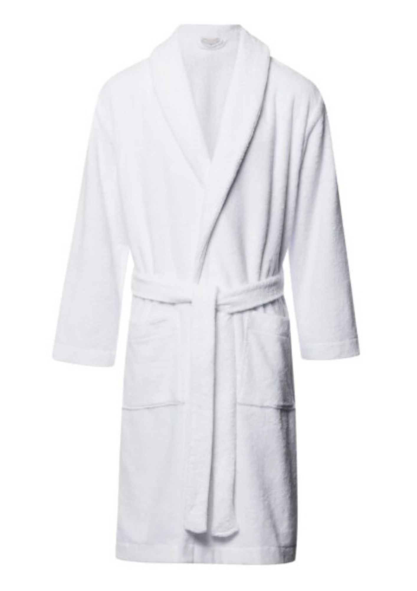 This cosy bathrobe made from absorbent terry cloth/velour material is essential for creating that daily feel-good moment after showering. The timeless design features a stylish shawl collar, tie belt and two patch pockets with subtle HANRO embroidery. The robe has the classic composition of cotton and a little polyester for even more softness. The mid-length terry cloth robe is also ideal as a comfortable companion for the sauna, swimming pool, spa or when travelling.