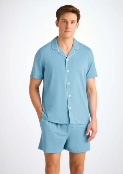 The perfect gift. Our Men PJ Set Short Atlantic Green has a classic fit with contrasting piping along the length of the shirt and leg opening of the shorts. Made in Pima Cotton Modal fabric with our special wash; luxury finish for a butter-like touch and long lasting quality.