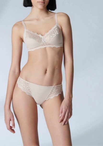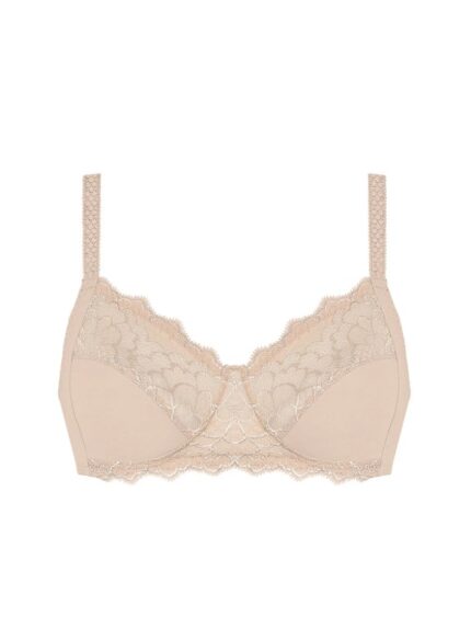 Soft cup bra with an under-wire and full coverage to the cups. Naturally comfortable and supportive fit. Embroidered cups on tulle, full high basque in Calais leavers lace. Upper bra in tulle with rhinestone motif. Silver-plated rings on straps.
