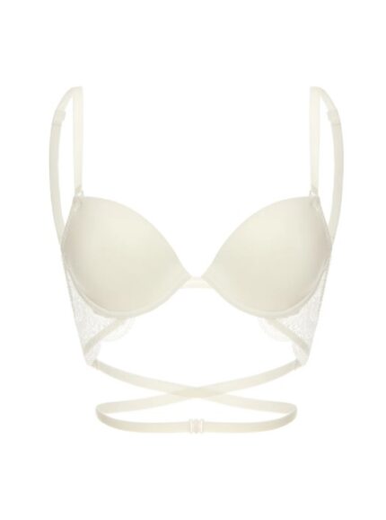 Cups adorned with scalloped multi-thread embroidered lace at cleavage. Embroidered scalloped band with back straps and golden rings. Satin spaghetti straps embellished with a golden ring. Satin bow and rhinestone jewel at the cleavage