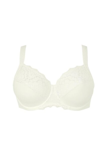 Molded cup adorned with scalloped multithreaded embroidery and guipure. Lace back bra band. Removable straps