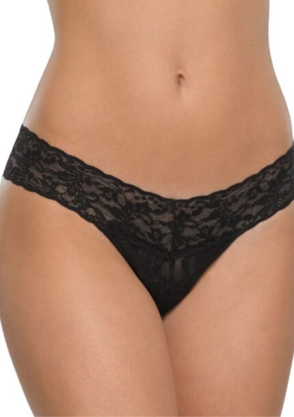 Thong in embroidered laize on tulle at the front, with a coordinated scalloped embroidery panel on the side. Scalloped lace at the back adorned with a small triangle of crystal tulle. Small lace trim at the waist. Double elastic ribbon side straps and small lace trim with gold metal rings.