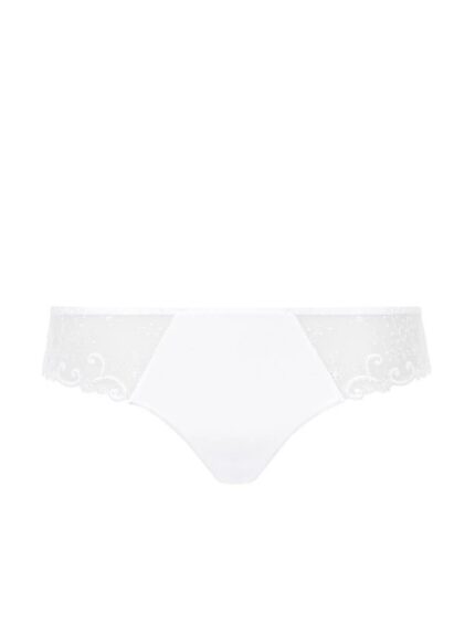 String in tulle with scalloped embroideries and lace, both at the front and back thighs. The front top features crystal tulle surrounded by V-shaped scalloped embroidery, while the bottom front features coordinated laize. The back is structured by an adorned triangle of embroidered laize at the middle back waist. A small lace trim at the waist