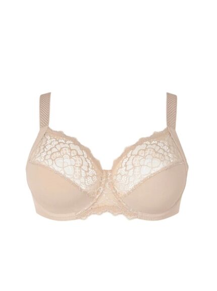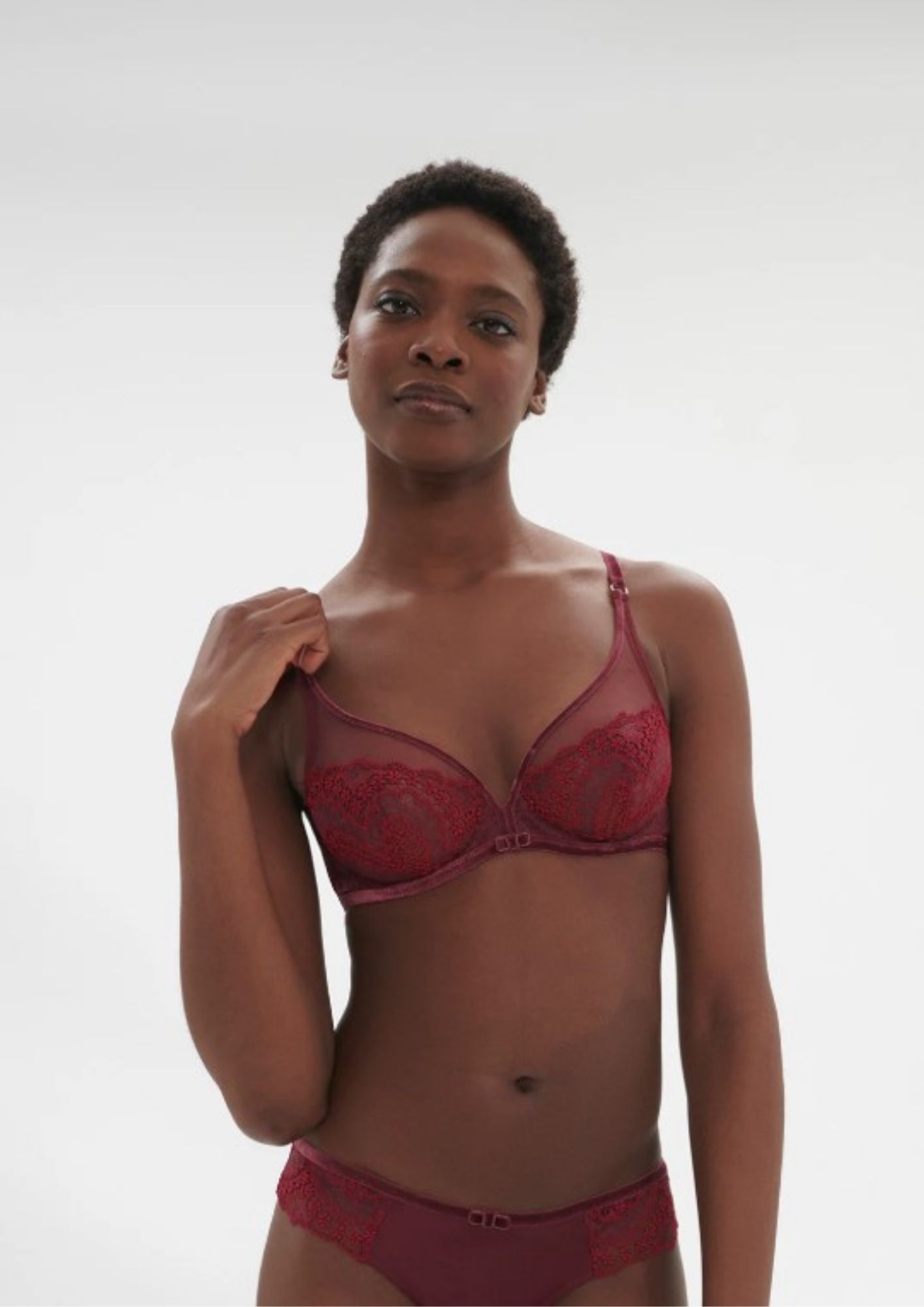 This stunning underwire plunge bra has an elegant full coverage shape that showcases an exquisite mélange of French embroidery on lace, velvet trim, and sheer tulle. The Scenario Full Coverage Plunge supports and shapes the bust with unlined cups and a sheer, U-shaped back.