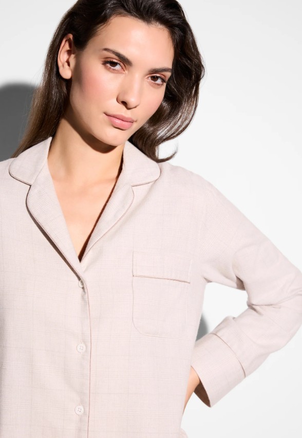 Cuddly soft, warm and the perfect companion for the night. These long pyjamas for women with long sleeves and long trousers stand out thanks to their unique fine merino wool/cotton blend and elegant piping details. The pyjama top has a lapel collar and fastens with a full-length button placket with mother-of-pearl buttons, while the trousers are designed with an elasticated waistband. The long women’s pyjamas from the Cozy Flannel line are made from particularly soft cotton fabric with a wool content. The flannel fabric is warm, lightweight and particularly good at absorbing moisture. A cosy companion for your nights.