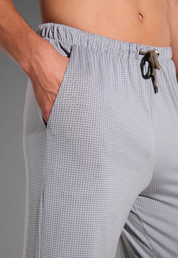 Superior softness and temperature balancing meets decorative print. These long pants for men impress with a hidden, elastic waistband and additional drawstring with cord for fine adjustment. The ends of the cords as well as the cord eyelets are finished with grey metal elements on which the Zimmerli of Switzerland logo has been engraved. There is a slightly slanted pocket on each side. The cut is loose and comfortable offering enough freedom of movement.